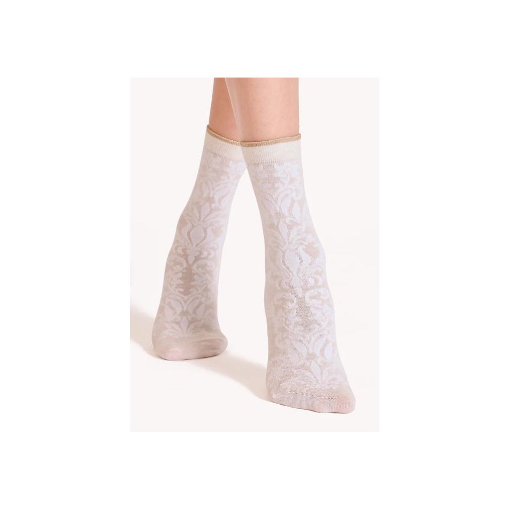 Módní ponožky z viskózy a kašmíru s tónovaným damaškovým vzorem. Pohodlný lem zdobený lamé vláknem, anatomicky tvarovaná špička a pata. S označením kvality a nezávadnosti Oeko-Tex® Standard 100.